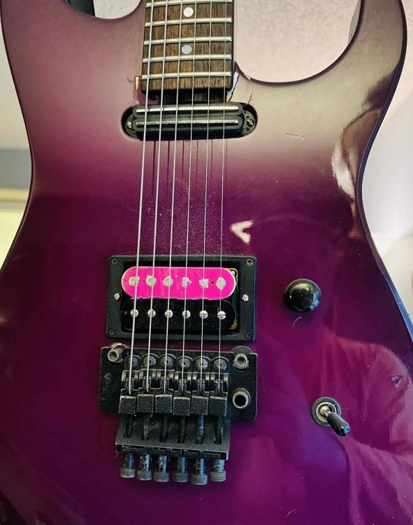 Dude...I love that guitar...I bet it sounds freaking AWESOME...sometimes those Frakenstein creations are the absolute best because it's totally you at this point. Love the color too...that's beautiful. Ill post up a few pics of my studio...it's still pretty barebones but I have a lot of sound deading panels that are color coordinated to the new guitar and all....again...thank/blame Mrs. OldSkool...lol